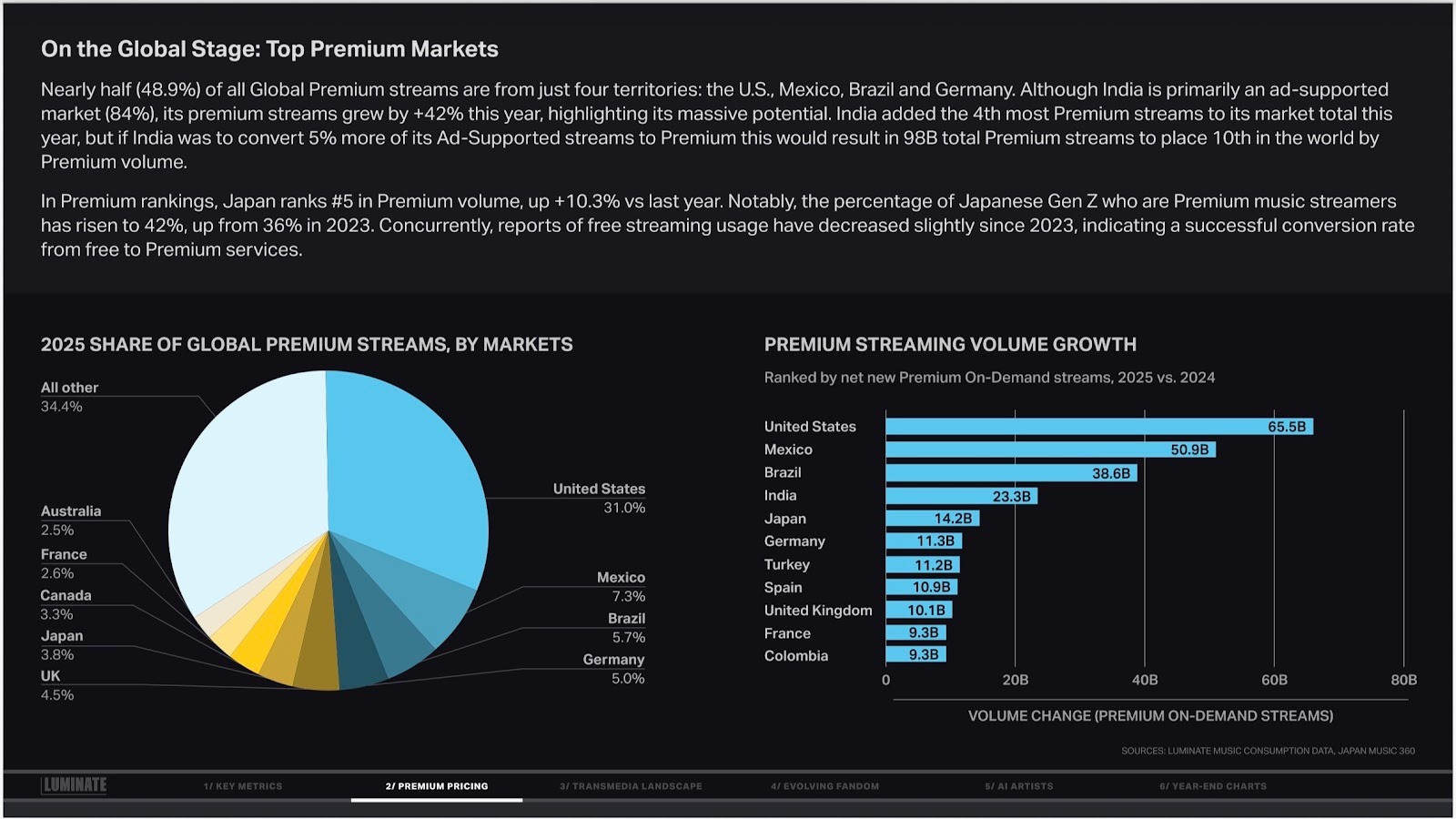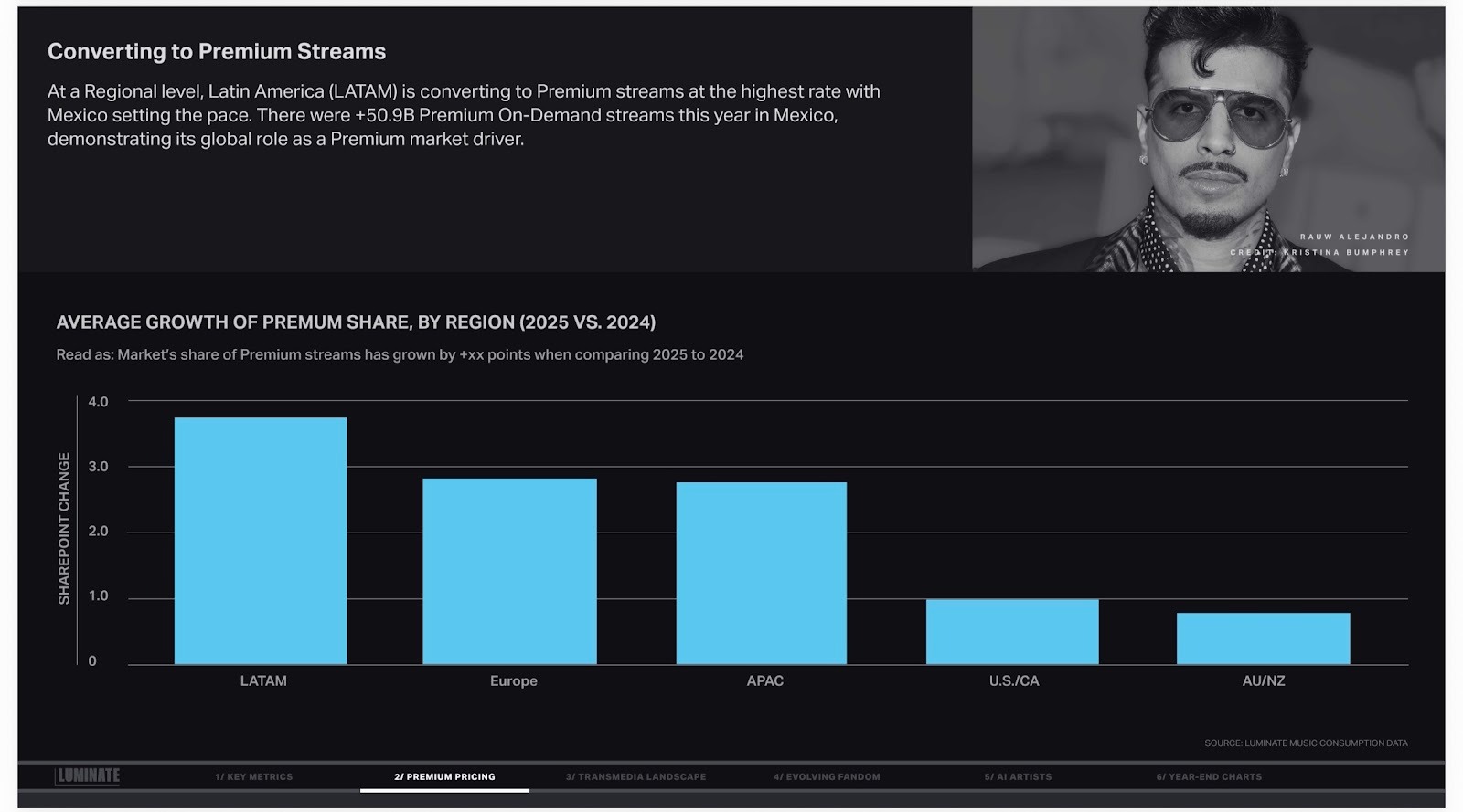 If you’re looking to expand your music into a new market, LATAM should be high on your list. As published in the Luminate 2025 Year-End Report, music listeners in the region convert to premium streams at the highest rate, with Mexico leading the way and solidifying the region's global role as a premium market driver.
