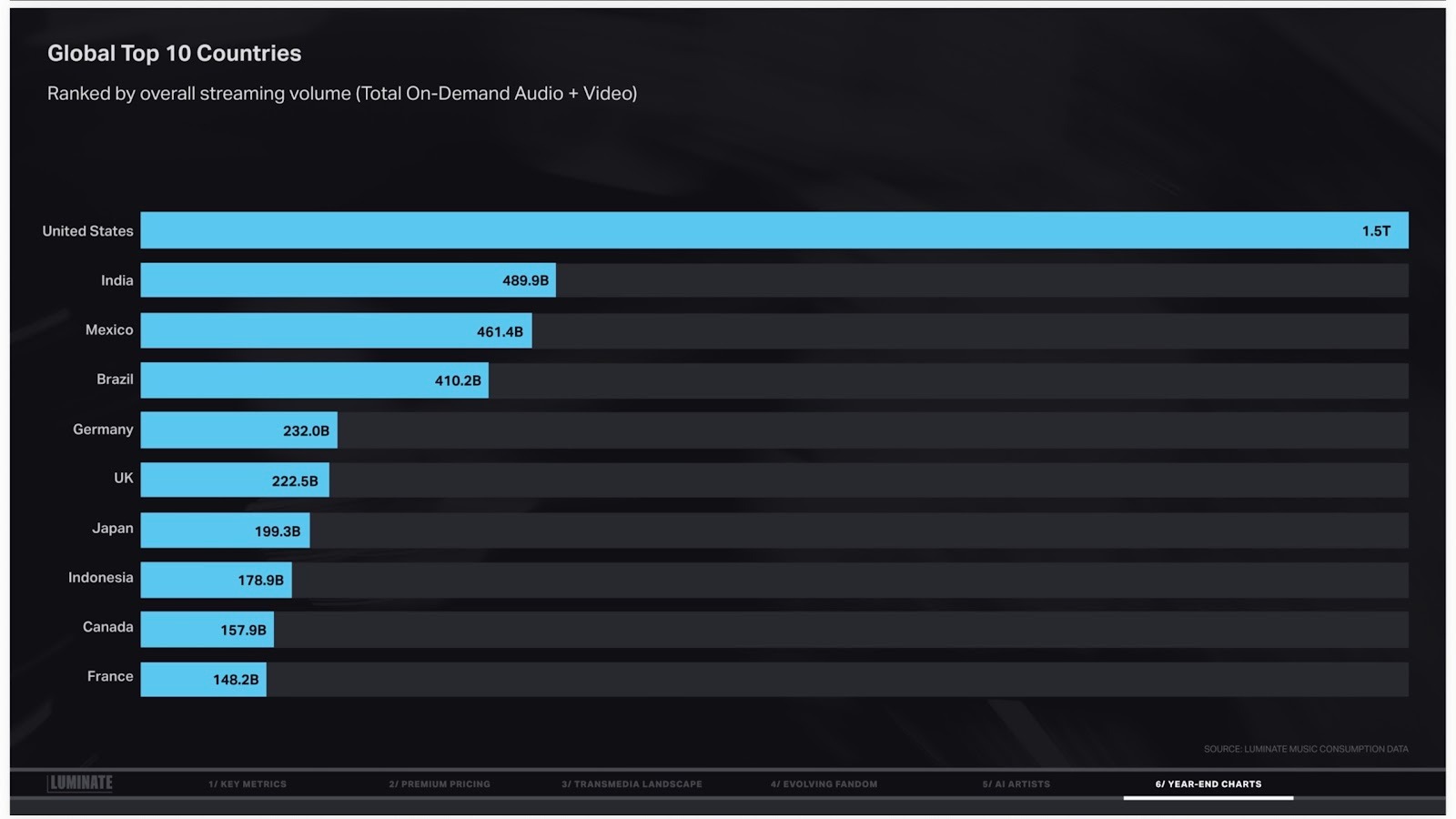 Mexico and Brazil also stand out as two of the four countries with the most streaming volume, following the US and India in 1st and 2nd place, respectively. Mexico ranks 3rd (461.3B streams) and Brazil ranks 4th (410.2B streams).